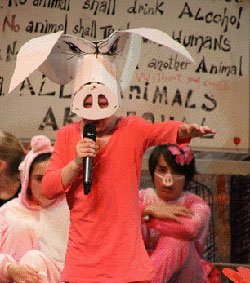 I was keen to write something well-tailored to the young age of the cast and was keen to avoid some of the pitfalls that occur when professional musicals are performed by student groups (even if they have been adapted for children). In order to ensure the show's performance was musically strong we decided to write the majority of the songs as big choral pieces, thus diminishing the reliance on solo singers. We tied in the choral numbers by setting the first and last scene at a choral eisteddfod in a country fair, had the pigs sing a song as a large group and had all the cast join in with 'Old Major's Dream' as they took up his manifesto that 'all creatures are equal'.