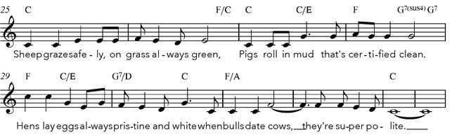 Another of the challenges, perhaps the most important, was how best to set some of the more ridiculous lyrics to music. I decided pretty early on that any outrageous jokes needed to be hammed up (pun intended). Accordingly I wrote many of the verses with a prolonged final phrase in order to give the audience time to process the punchline.
