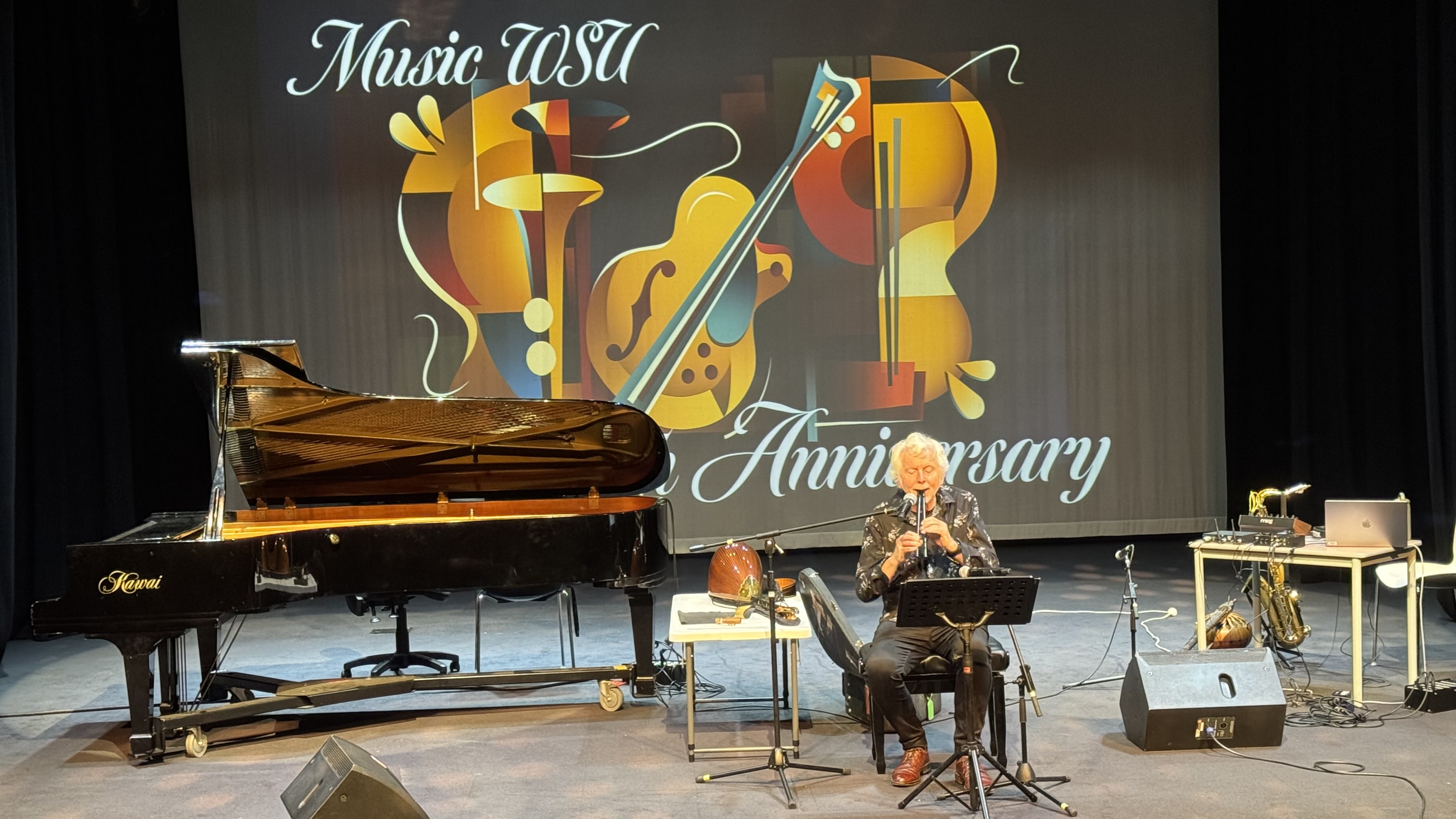 Dipping and rising beauty from a single tonei vibration on the Chinese guzheng, like a wave kicked into rippling motion from an unknown source, filled the Playhouse Auditorium at our Penrith Campus in the middle of 30th Anniversary Concert of the Music Area at Western Sydney University. Here, the performer's body rolled and rippled with motions to release energy into the strings-the ancient art of Qiyunii, where Chuqiao Zhao calculated precisely her own energy flows to impart this sense of spirit into the sound. Her elegant posture suddenly changed, instead of yun-like gentle subtly of after-tones, our doctoral student from China threw the weight of her body at the instrument head striking the resonating chamber and strings simultaneously to a release a wave-crashing sound resonating into the space like a storm, to leave an audience gasping. Venerable Chinese composer and long-term resident of downtown New York, Chou Wen-Chung, talks of the ancient and contemporary power of this aesthetic as "Asian esthetics a flowing stream, which pushes forward irreversibly in constant response to an ever-changing environment and in eternal search for the future, and in which the past lives in the present.iii" Here the musical energy was a palpable force to inform the present with the ancient and yet set-up waves of possibilities for future creativity. The sonic energy of the concert was ably supported and subtly distributed by technical officer and former Master of Research composition student, Alexander Frendo at the mixing desk, with funding support from Western Sydney Creative, through Dr Brendan Smyly's Art of Sound program.
