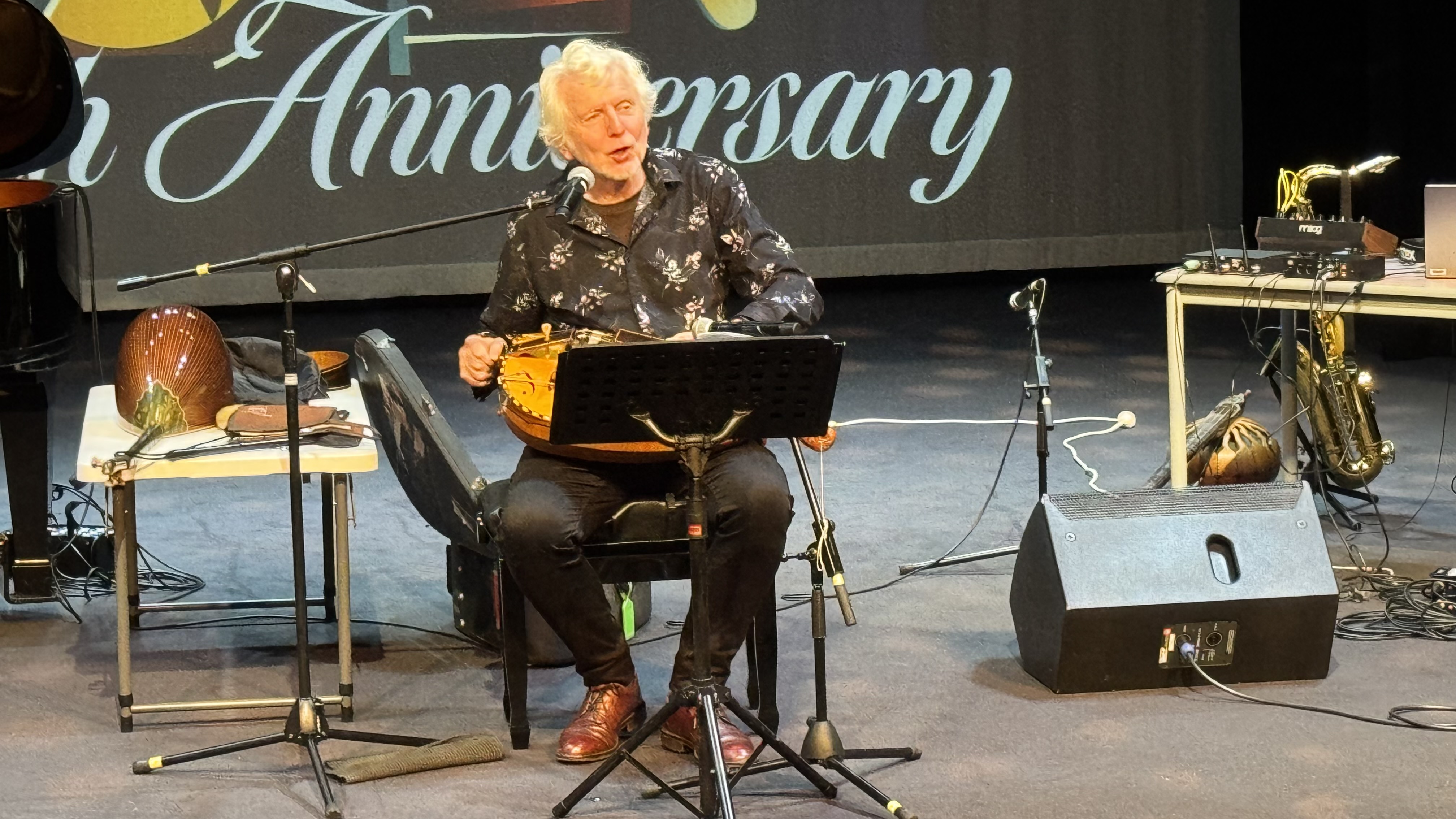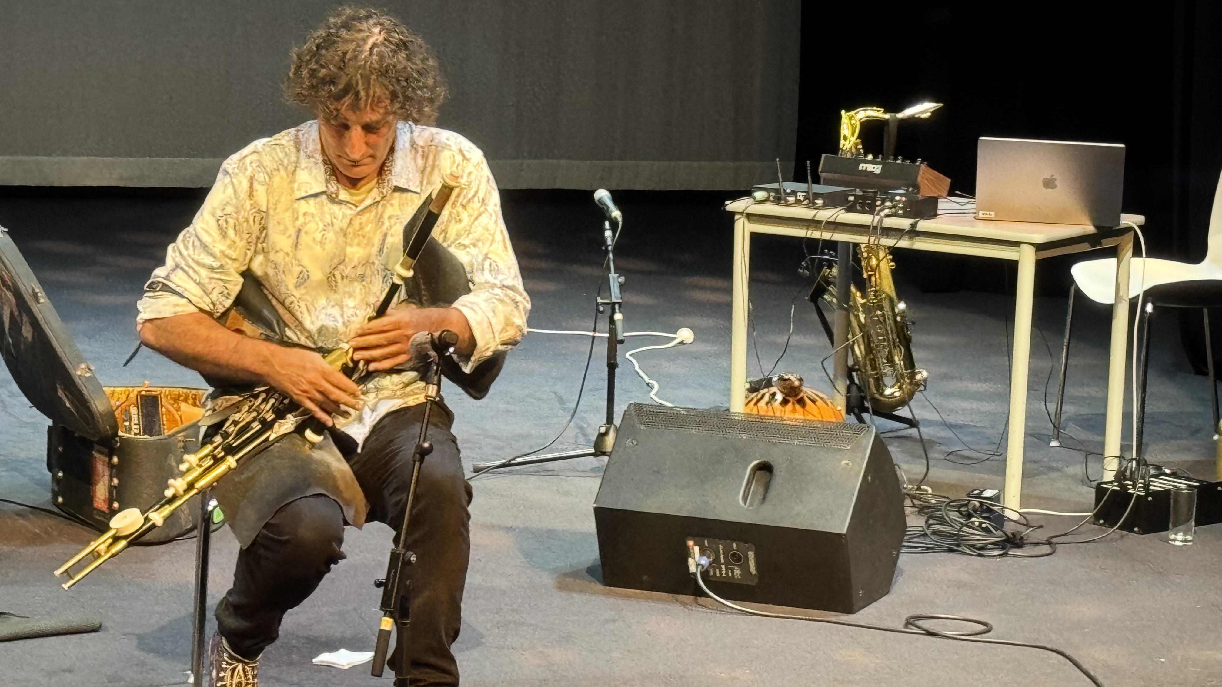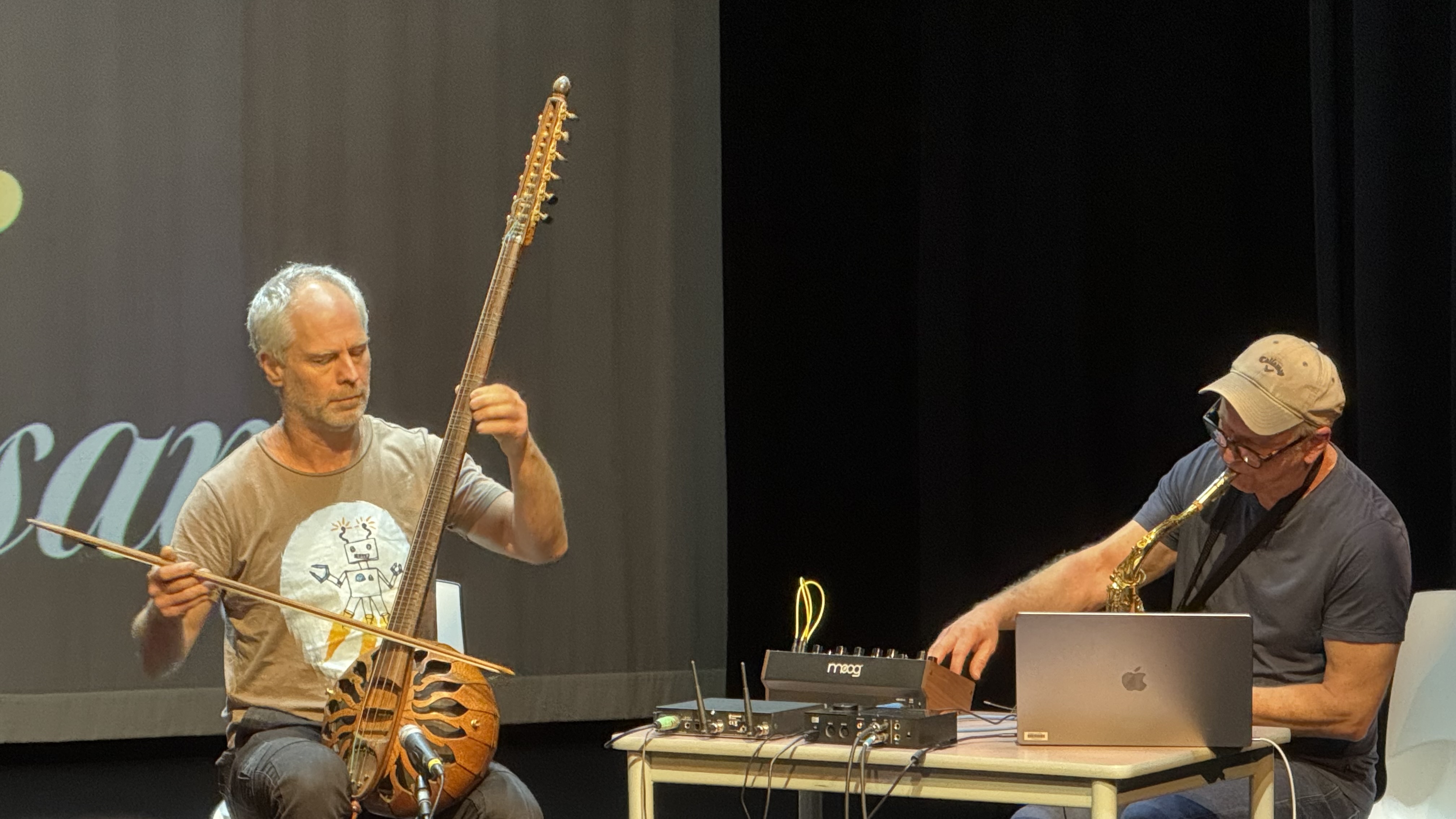 One her pupils, and now our colleague, is Dr Brendan Smyly who performed with breathing subtly on saxophone and created electronic rippling of the sounds, similar to the Burgess-Blom's sonic circles, in collaboration with his Blue Mountains neighbour, instrument builder Justin Montefiore. Here, Brendan and Justin were locked in breathing saxophone subtly of poignancy within revealed rippling delicate harmonics on strings in the tarhu-a mixture of Chinese erhu and Turkish tambur. It felt like the emerging presences of gently contrasting of bush, bird and cicada delicacy of the Blue Mountains National Park of the pair's lived environs were present in the auditorium space.