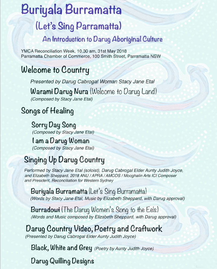 Buriyala Burramatta (Let's Sing Burramatta) - words by Stacy Jane Etal, composed by Elizabeth Sheppard, with Darug approval